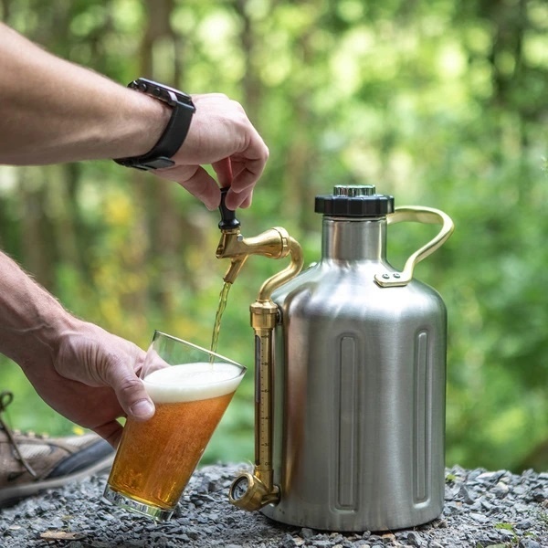 The uKeg pressurized growler is a mini keg in the size of a full-gallon growler, keeps beer cold, fresh and carbonated for two weeks. On the go or at home. Durable, double-wall vacuum insulated stainless steel. CO2 regulator cap with customizable tap handle and gauge. Includes two 16 gram CO2 cartridges. Available in multiple finishes.